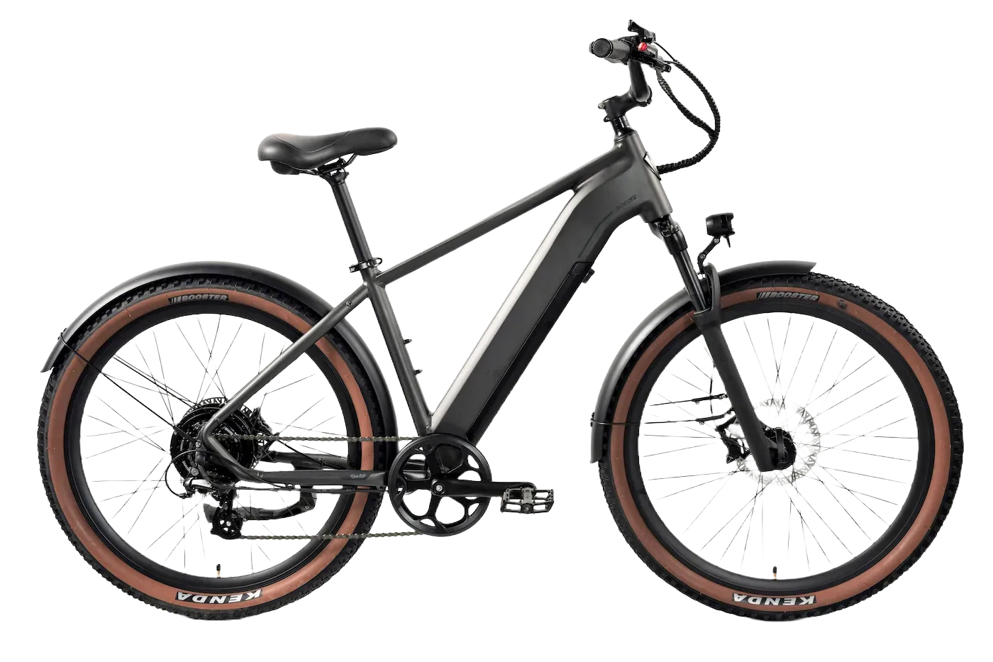 For the mechanical side of things, Ride1Up went with a Shimano Altus 7-speed drivetrain. The gearing range is decent, though I did find myself wishing for one more “hard” gear when cruising at twenty-eight miles per hour to keep my legs from spinning too fast. Shifting was crisp and reliable throughout my rides. One of the highlights for me is the inclusion of hydraulic disc brakes. These are brakes that use a closed fluid system to apply pressure, offering much more stopping power and better “modulation” or control than traditional cable brakes. Given that this bike can easily hit nearly thirty miles per hour, having that reliable stopping power is a massive confidence booster. The tires are 27.5-inch Kenda Boosters with a 2.4-inch width. They have a knobby tread that works surprisingly well on pavement but provides just enough bite to handle loose dirt or gravel paths without washing out.